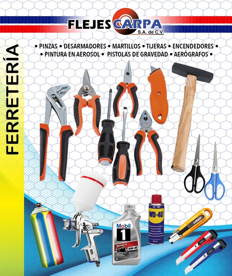 Herramientas y artículos de ferretería para mantenimiento, instalación y trabajos operativos.